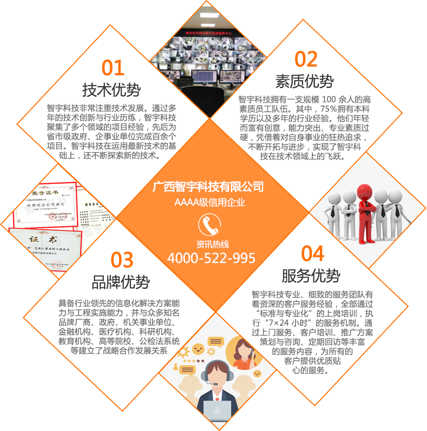 廣西智宇科技有限公司,自1995年成立以來(lái),已發(fā)展成為一家高新技術(shù)企業(yè),擁有多家分公司,遍布南寧、桂林、玉林、河池、扶綏、百色、欽州、防城港等地。憑借30年的專(zhuān)業(yè)經(jīng)驗(yàn)和技術(shù)儲(chǔ)備,智宇科技已成為一家行業(yè)領(lǐng)先的集團(tuán)企業(yè),致力于運(yùn)用前沿科技產(chǎn)品和技術(shù),為客戶提供高效服務(wù)。